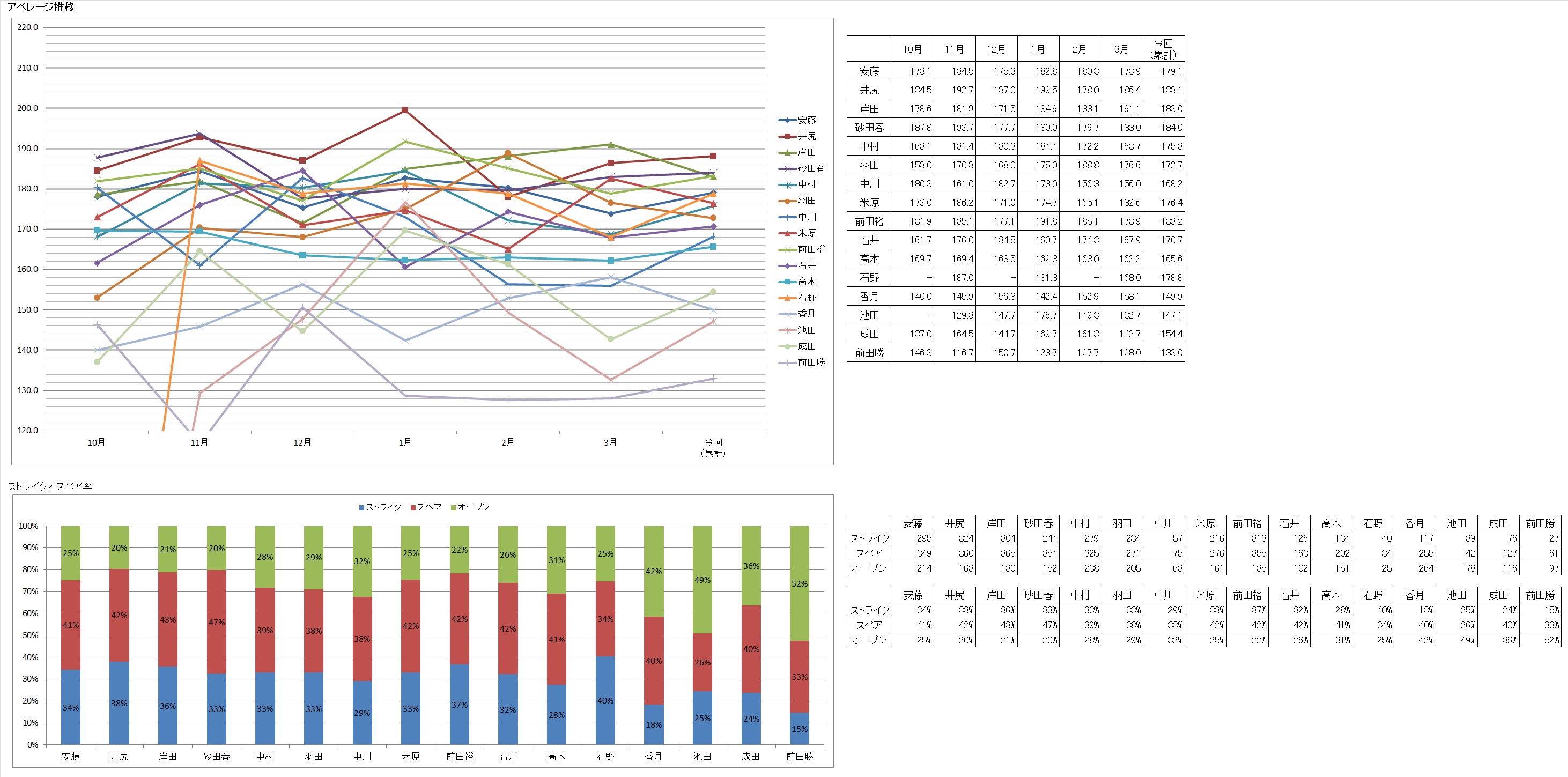 | ストライク数 | 43 | 33% | 6 | 54 | 42% | 1 | 45 | 35% | 4 | 29 | 30% | 11 | 46 | 35% | 5 | 31 | 32% | 8 | 12 | 36% | 2 | ストライク数 | 39 | 30% | 10 | 41 | 32% | 7 | 23 | 35% | 3 | 40 | 30% | 9 | - | ## | 18 | 19% | 14 | 7 | 23% | 12 | 6 | 19% | 14 | 6 | 20% | 13 | ||||||||||||||||||||