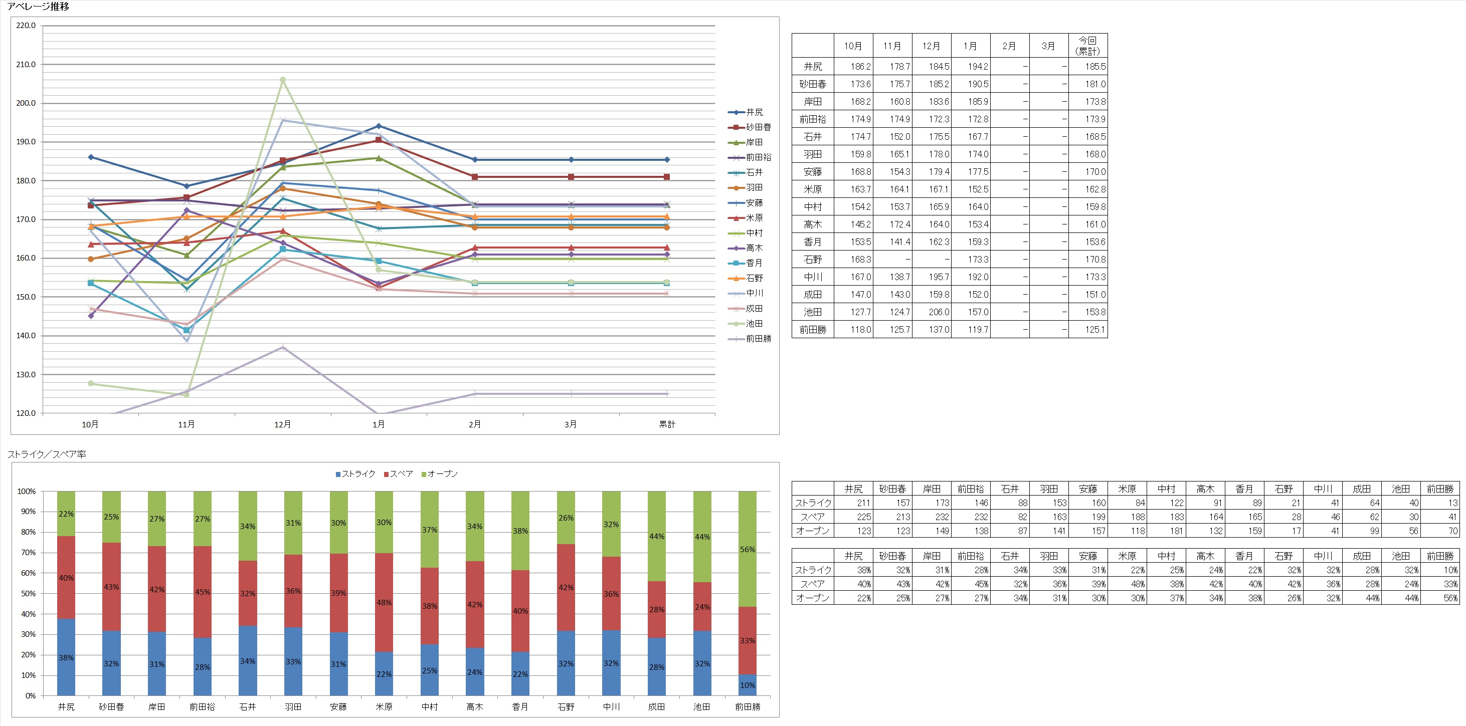 | ストライク数 | 43 | 33% | 3 | 36 | 27% | 6 | 34 | 26% | 7 | 44 | 34% | 2 | 12 | 39% | 1 | 41 | 32% | 5 | 33 | 26% | 9 | ストライク数 | 9 | 14% | 15 | 23 | 24% | 10 | 12 | 19% | 12 | 9 | 14% | 14 | 11 | 32% | 4 | 8 | 26% | 8 | 7 | 22% | 11 | 5 | 17% | 13 | 4 | 13% | 16 | |||||||||||||||||||